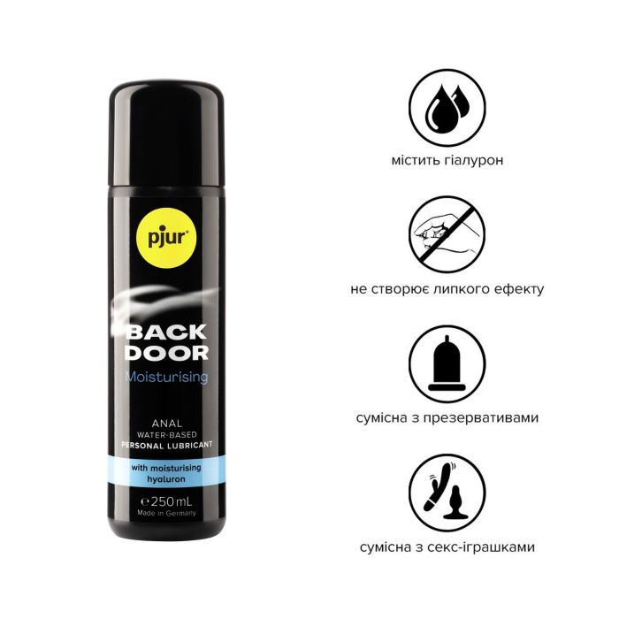 Pjur Backdoor Comfort Water Glide — основні переваги:- Гіалуронова кислота у складісприяє глибокому зволоженню, усуває сухість і покращує еластичність шкіри;