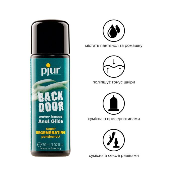 pjur Back Door Regenerating Anal Glide— лубрикант на водній основі, спеціально створений для комфортного анального використання. Завдяки тривалому зволоженню та догляду він допомагає зменшити відчуття тертя, дискомфорту та напруги під час інтимної близькості. Підходить також для застосування з еротичними іграшками.