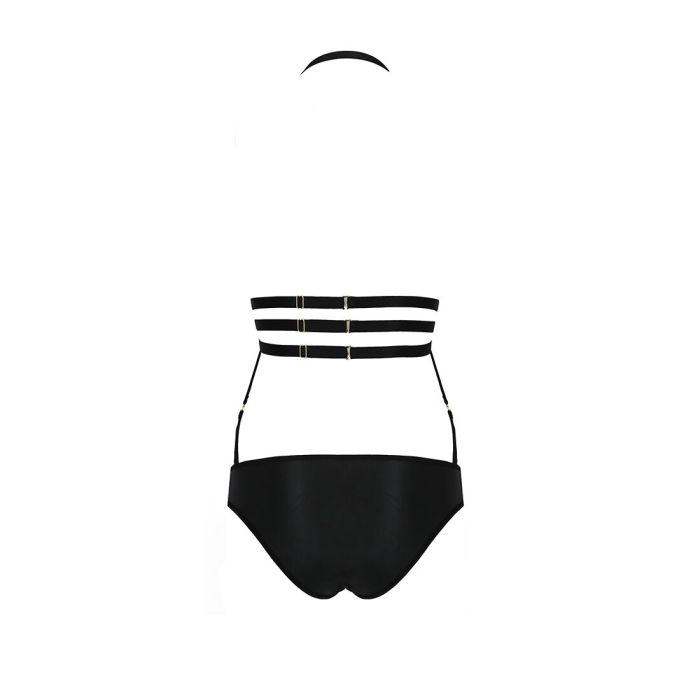 Боді виготовлено з ніжної тканини ламе з легким блиском, що додає шарму. Верхня частина має дизайн топа на одну регульовану бретель через шию, з глибоким V-подібним вирізом, який підкреслює зону декольте. Три еластичні ремінці огортають тіло та застібаються ззаду на золоті гачки, забезпечуючи надійність та комфорт. Низька посадка трусиків з’єднується зі стрепами на талії, створюючи завершений і гармонійний образ.