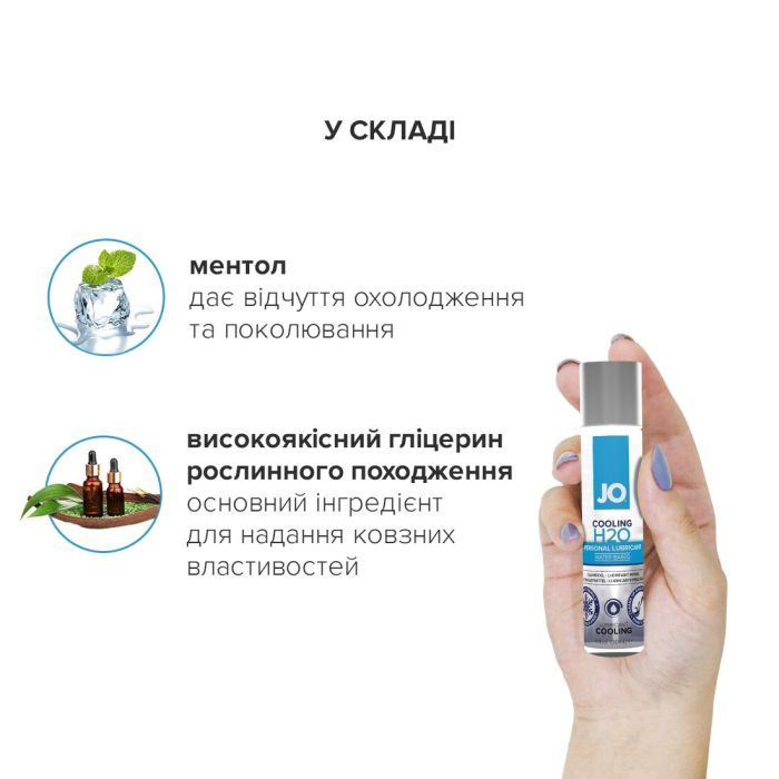 Лубрикант на водній основі System JO H2O — COOLING (30 мл) — це засіб на водній основі, що використовується як доповнення до природної змазки. Виготовлений із використанням гліцерину виключно рослинного походження, має велику популярність, забезпечує комфортне ніжне ковзання й не залишає відчуття липкості.