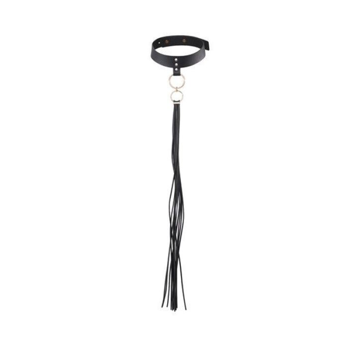 Жорсткість і жіночність, сила і покірність зійшлися в цьому розкішному чокері воєдино. Чокер стилізований під шкіру, прикрашений золотистим металом і в комплекті з декоративним "батогом" або краваткою - все разом виглядає дорого та якісно. Цей сексуальний аксесуар розбудить фантазію та відкриє ворота у світ еротичних ігор. Пограйте з прикрасою, вручіть "батіг" своєму партнеру як повідець - і ви пізнаєье один одного по-новому! Чокер підійде на різні обсяги шиї завдяки можливостям регулювання.