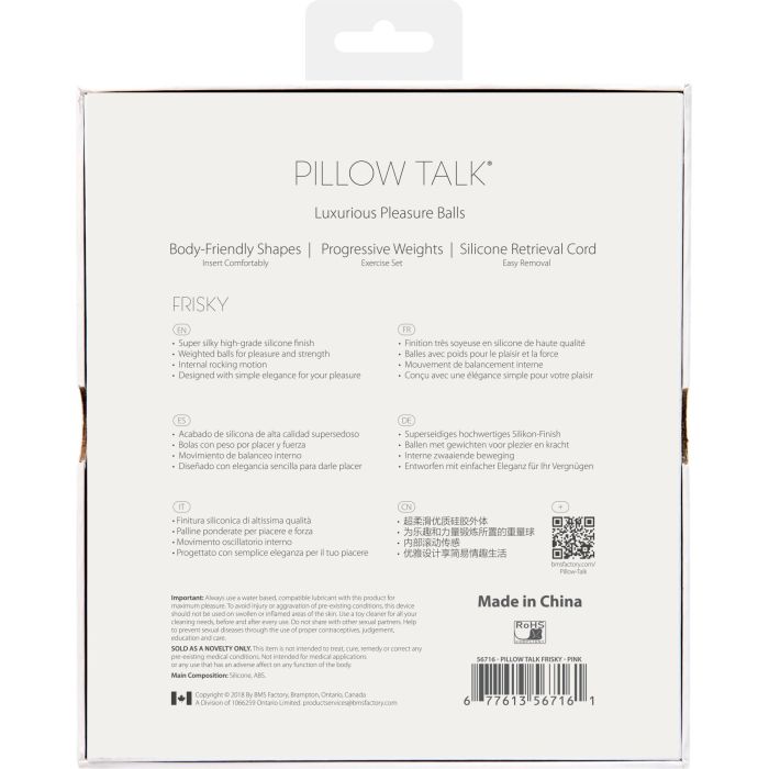 Щоб підвищити своє сексуальне задоволення і зміцнити вагінальні м'язи, рекомендуємо купити розкішні вагінальні кульки Pillow Talk - Frisky Pink з кристалами Swarovski. Шикарний шовковистий силікон і сліпучі кристали Сваровскі роблять кульки не просто корисним девайсом, а й лакшері-аксесуаром. Набір з одинарних і подвійних кульок зі зміщеним центром ваги, дозволяє ретельно опрацювати глибокі м'язи. Кульки різного розміру для максимальної ефективності.