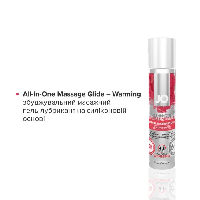 - JO All-In-One Massage Glide — Warming— універсальний гель-лубрикант на силіконовій основі з розігріваючим ефектом. Містить стимулюючі інгредієнти, створює шовковисту текстуру для масажу, зволожує шкіру і підкреслює яскравість татуювань.