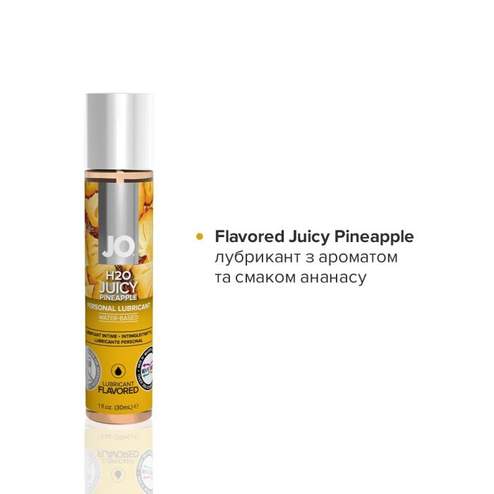 - Jo Flavored Juicy Pineapple— рН-нейтральний ароматизований лубрикант із насиченим запахом ананаса. Формула містить рослинний гліцерин та натуральні харчові ароматизатори, не містить цукру, парабенів і пропіленгліколю. Безпечний для орального застосування, не залишає післясмаку.