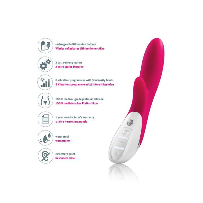Основна частина делікатно стимулює зону G, тоді як відросток пестить клітор, створюючи гармонійний баланс внутрішніх і зовнішніх відчуттів. Ви можете обрати один із 8 режимів вібрації та налаштувати 5 рівнів інтенсивності — від м’якого розігріву до насиченої пульсації. Два мотори працюють окремо або синхронно, дозволяючи адаптувати іграшку під ваш настрій — чи то тривала чуттєва гра, чи швидкий, яскравий фінал.