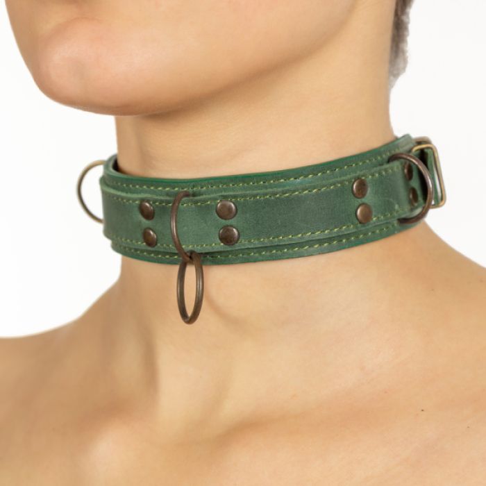 Зелений нашийник LOVECRAFT з напівкільцями і кільцем на центральній частині, для кріплення повідця, карабінів або мотузки для шібарі: