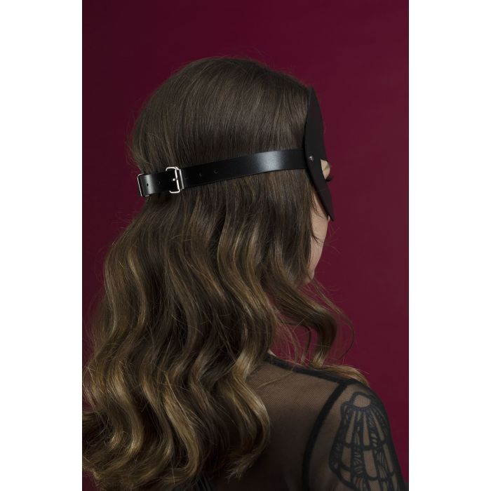 Маска невелика й акуратна, з маленькими вушками та сріблястою фурнітурою: заклепками та пряжкою. Вона стильно виглядає та м'яко адаптується до обличчя будь-якої форми. Виготовлена з високоякісної шкіри рослинного дублення.