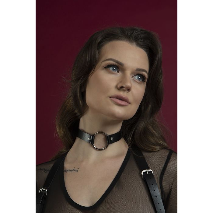 Шкіряний чокер чорного кольору, прикрашений металевим кільцем, точно знайде своє місце у вашій колекції аксесуарів. Виготовлений із високоякісної шкіри рослинного дублення, красивий і приємний на дотик.