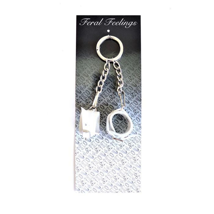 Мініатюрна версія наручників виготовлена з натуральної шкіри рослинного дублення. Кожен наручник кріпиться до основного кільця-карабіну ланцюжком і міні-карабіном, тому можна носити тільки один наручник, а другий - подарувати своєму партнеру у якості символу.