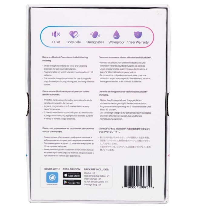 Зовні Lovense Diamo Cock Ring схоже на звичайне ерекційне кільце - петля для члена і віброелемент у відростку, але це не зовсім так. Кільце досить широке - в діаметрі 4,5 см, гнучке, але практично не розтягується. Тому надіти його можна на член в неерегованому стані або якщо діаметр ерегованого члена менше діаметра кільця. Виходить, кільце служить більше для фіксації віброелементів на члені, але за рахунок того, що воно дуже щільне - добре передає вібрацію віброелементів на всю окружність члена і сприяє таким чином кращому збудженню і ерекції. Стійка ерекція, фантастично потужні оргазми і підвищена сексуальна витривалість - те, що ви отримаєте, використовуючи смарт кільце-насадку Lovense Diamo Cock Ring! Спробуй відправиться з ним на побачення або в кіно, і насолодись вібраціями у найнесподіваніший момент! Керувати можна як самостійно, так і передавши гру в руки партнерки або партнера.