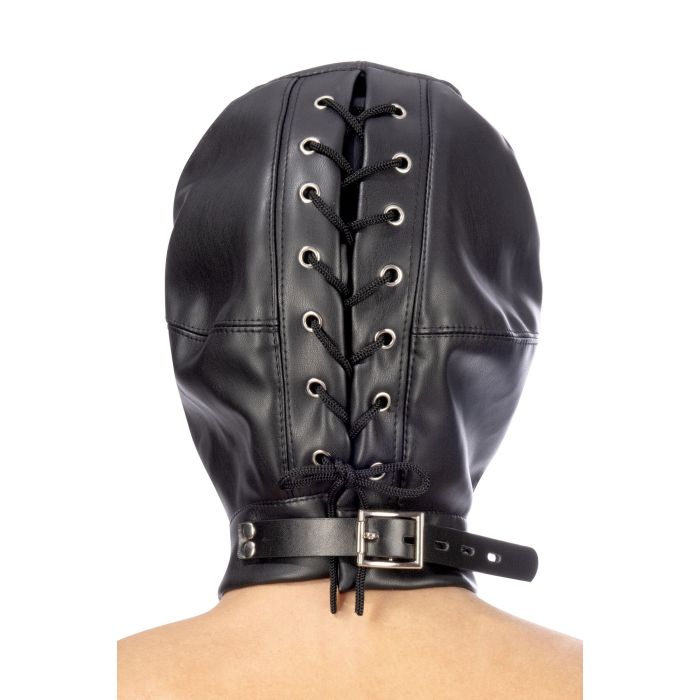 Позаду капюшон з кляпом для БДСМ Fetish Tentation BDSM hood in leatherette with removable gag застібається на ремінець з пряжкою (5 отворів у ремені, щоб максимально підігнати під ваші параметри). Окружність голови вільно регулюється за допомогою шнурівки по всій висоті, таким чином капюшон підійде на будь-який розмір голови. Еластична підкладка зі спандекса полегшує процес надягання.