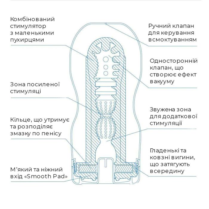 - 4 внутрішні зони: ніжний вхід, щільне стиснення, м’яке вивільнення та зона екстремального вакууму з отвором для контролю;