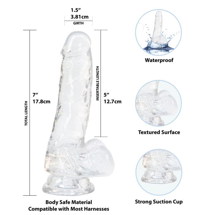 Прозорий фалоімітатор на присосці ADDICTION — Clear Dildo with Balls 7″, віброкуля в подарунок