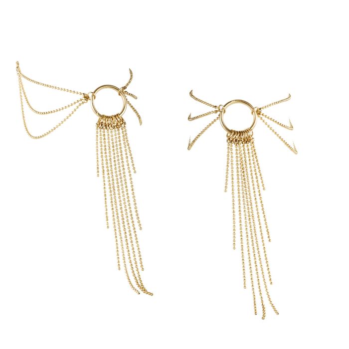 Додайте шик та блиск у будь-який свій образ із яскравою деталлю — купіть прикрасу для ніг Bijoux Indiscrets Magnifique Feet Chain — Gold. Два елегантні браслети прикрасять ваші кісточки тоненькими ланцюжками, що виходять у декількох напрямках із центрального кільця. На кінці найдовшого ланцюжка є невелика петелька, завдяки якій ланцюжок можна зачепити за пальчик.