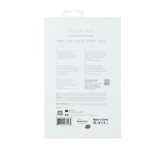 Розкішний кролик із ротацією та вібрацією Pillow Talk Lively виготовлений з абсолютно безпечних і високоякісних матеріалів. Зверніть увагу: девайс не є водонепроникним, тому використовуйте для очищення спеціальні засоби.