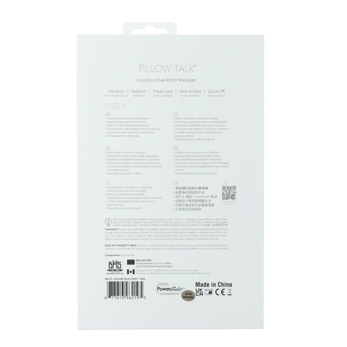 Розкішний кролик із ротацією та вібрацією Pillow Talk Lively виготовлений з абсолютно безпечних і високоякісних матеріалів. Зверніть увагу: девайс не є водонепроникним, тому використовуйте для очищення спеціальні засоби.