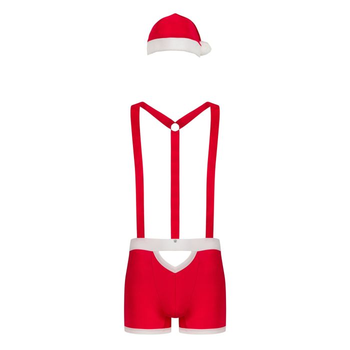 Цей лаконічний, але сексуальний костюм складається з червоних трусів-боксерів, що щільно облягають стегна та сідниці. Білі широкі резинки натякають на роль слухняного хлопця, готового виконати будь-яке бажання. Боксери виготовлені з м'якого матеріалу, що підходить для щоденного носіння. Стильні вирізи спереду і ззаду та сріблястий медальйончик додають елегантності, а декоративні підтяжки та імітація портупеї з металевим кільцем виглядають дуже сексуально. Шапочка Санти з помпоном завершує образ.