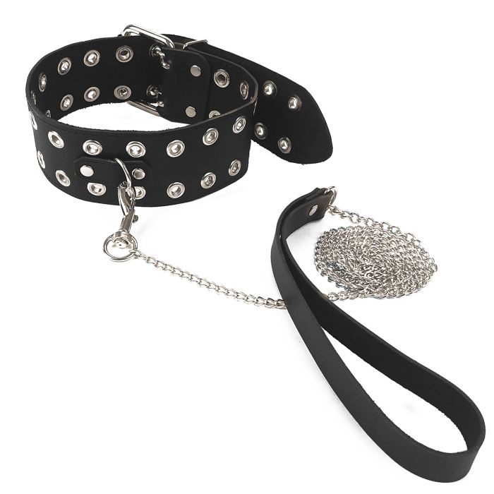 Нашийник Art of Sex -Tessa із натуральної шкіри в парі з металевим повідцем - обов’язкові аксесуари для тих, хто практикує рольові ігри з домінацією та підкоренням. Комфортний нашийник легко регулюється по об’єму шиї, а повідець можна знімати за бажанням, або якщо цього потребує сценарій. Нашийник декоровано металевими заклепками для більш аутентичного та провокативного вигляду.