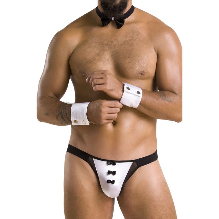 Комплект еротичної чоловічої білизни Passion Alfred — стильний вибір для спокусливих образів. Складається з трусів, комірця-метелика та манжетів у класичному чорно-білому поєднанні. М’який матеріал, ніжна сіточка та декоративні бантики додають грайливого акценту.