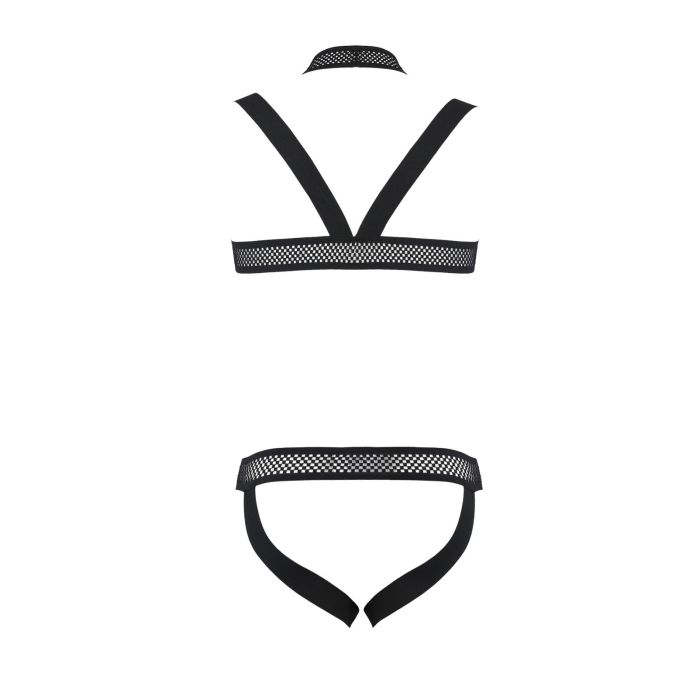 Комплект складається з трусиків із бандажами, виконаних з м’якої екологічної шкіри та еластичної сітки. Ззаду труси відкривають сідниці, додаючи спокуси. Спереду є два кріплення для аксесуарів, що дозволяють комбінувати комплект з іншими елементами.