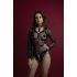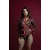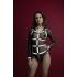 Збруя виконана з безлічі широких шкіряних ременів, з’єднаних між собою заклепками й десятьма кільцями великого діаметра. Ці кільця можуть мати додаткову функцію: до них можна причепити карабіном ланцюг, зав’язати мотузку або текстиль. Міцні кільця також можуть допомогти у процесі зв’язування та знерухомлення партнера для кращої безпечної фіксації. Ремені оперізують, гарно лягають на шию чокером, описують груди та животик. На спинці кожен ремінь має безліч отворів та пряжку для можливості ідеально «підігнати» аксесуар під будь-який тип фігури та розмір. Промежину спереду й сідниці ззаду прикрашає подвійний ланцюг. Він, ніби стрінги, лягає на тіло, відкриваючи доступ до інтимних місць. У наборі також є широкі манжети-наручники, вони застібаються на пряжку. Широкі короткі ланцюги від наручників кріпляться до бічних ременів збруї.