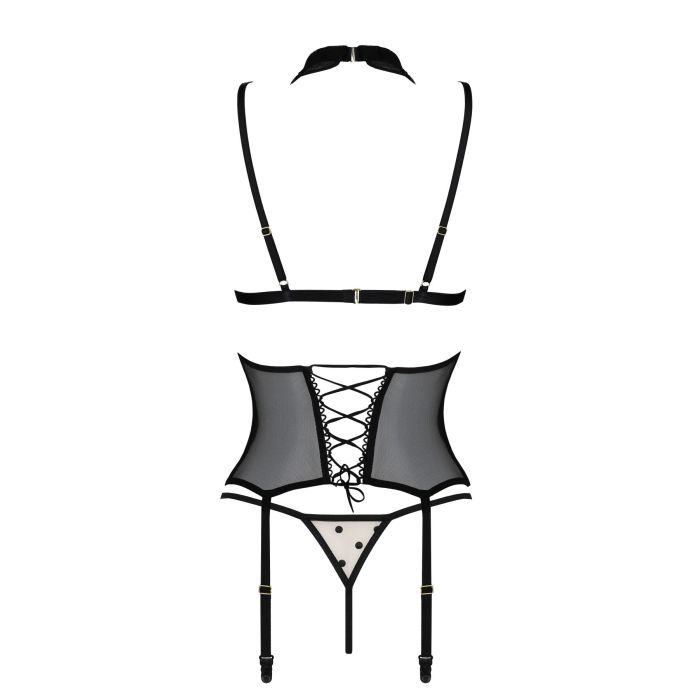 Цей корсет виготовлений із прозорого матеріалу в горошок, що додає інтимності та чуттєвості кожному руху. Відкриті чашки акцентують увагу на грудях, а плечові ремені та підв'язки можна регулювати для максимального комфорту. Шнурівка на спині додає класичного стилю та допомагає ідеально підігнати комплект під фігуру.