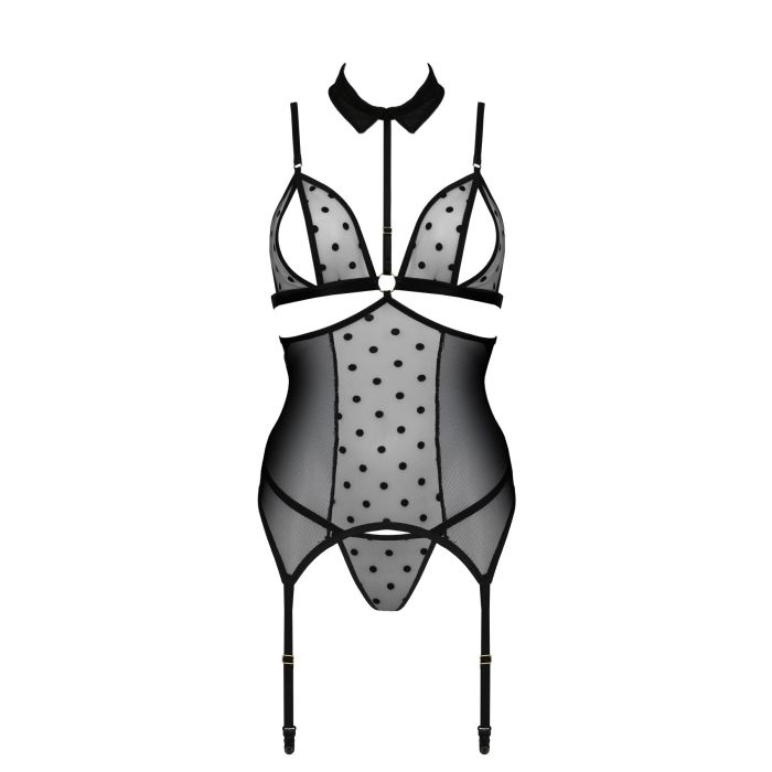 Модель виготовлена з прозорого матеріалу в горошок, що додає звабливості та грайливості кожній деталі. Відкриті чашки привертають увагу до грудей, а плечові ремені та підв'язки регулюються для максимального комфорту та зручності. Шнурівка на спині створює ідеальну посадку, дозволяючи вам відчути себе максимально спокусливо.