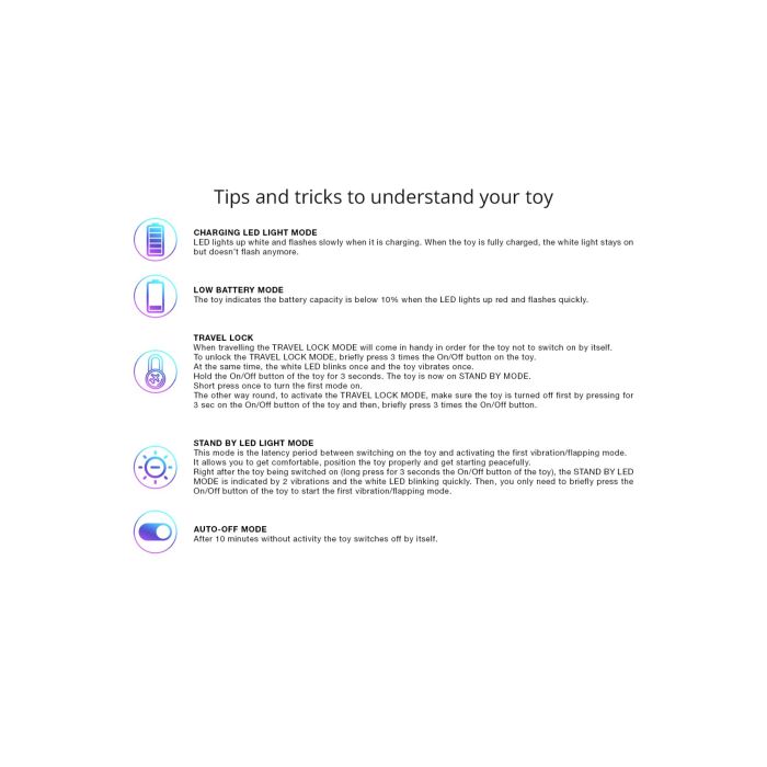 Завдяки водонепроникності за стандартом IPX7 стимулятор можна використовувати у ванні або душі. Компактні розміри 9,8 см дозволяють брати його з собою в поїздки. Функція блокування запобігає випадковому ввімкненню під час транспортування.