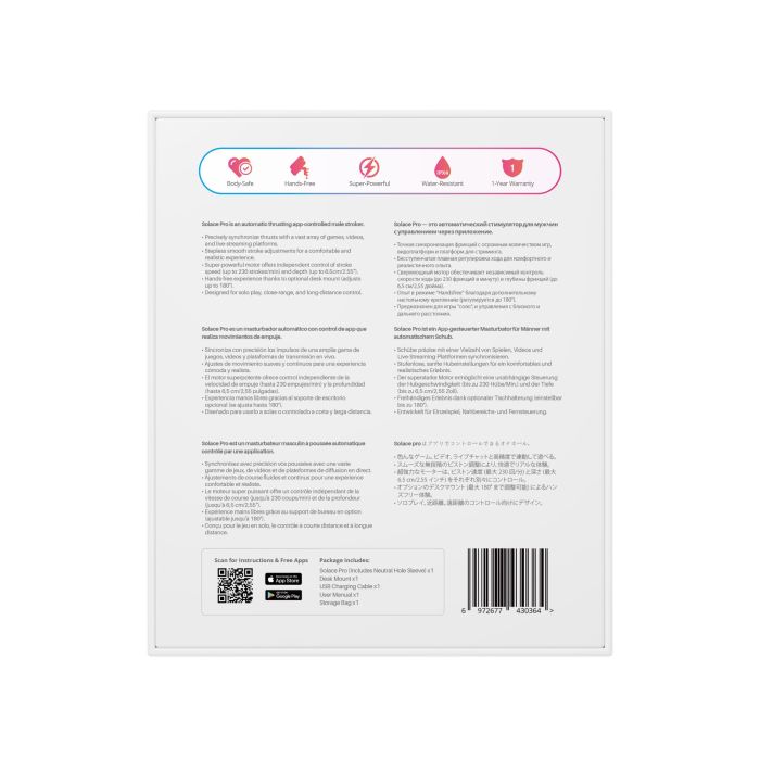 Купити інтерактивний смарт-мастурбатор Lovense Solace Pro — це можливість повністю адаптувати інтимний досвід до своїх потреб. Оновлена версія мастурбатора враховує побажання користувачів і пропонує покращену продуктивність: згідно з даними виробника, пристрій здатен виконувати до 300 фрикцій на хвилину, хоча на упаковці вказано максимум 230 фрикцій/хв (ймовірна технічна розбіжність). Solace Pro оснащено більш ємною батареєю, яка забезпечує до 14 годин безперервної роботи, та плавним мікрошаговим регулюванням довжини ходу — з кроком лише 0,65 мм.