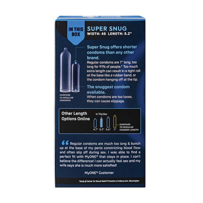 Якщо стандартні презервативи здаються занадто вільними, спробуйте MyONE Super Snug — варіант із ультракомпактною посадкою для тих, хто цінує повний контроль, комфорт і фіксацію без компромісів.