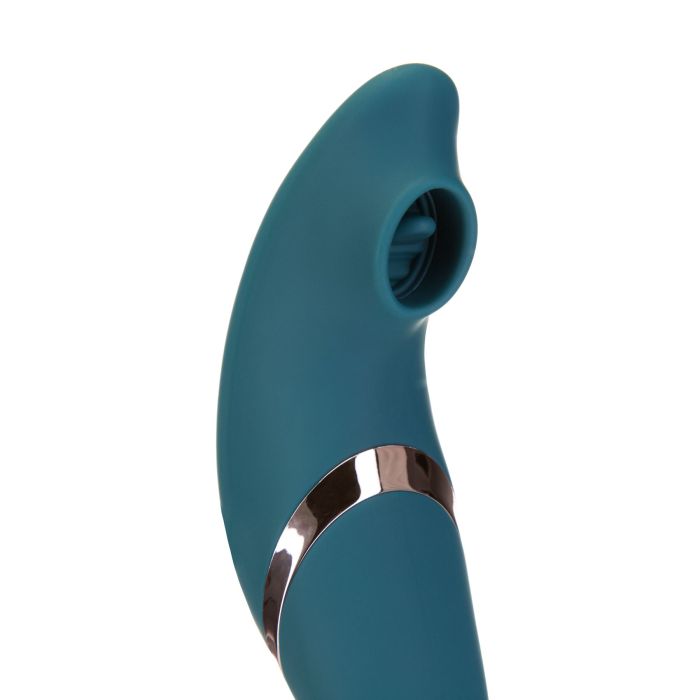 - У розігнутому вигляді іграшка стає двосторонньою: з однієї сторони вібратор, з іншої — вакуумний стимулятор із язичком